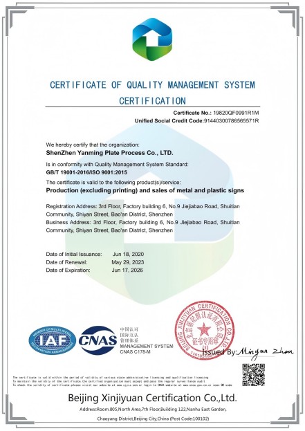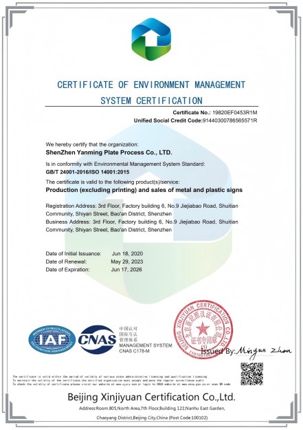 2024.01.01 -Shenzhen Yanming Signage Technology Co., Ltd., un principal fabricant de précisiongravureLes produits en Chine ont officiellement obtenu la certification ISO et la certification de la conformité ROHS, renforçant sa position de partenaire fiable pour les clients mondiaux dans des secteurs tels que l'électronique, les dispositifs médicaux et la signalisation industrielle.
